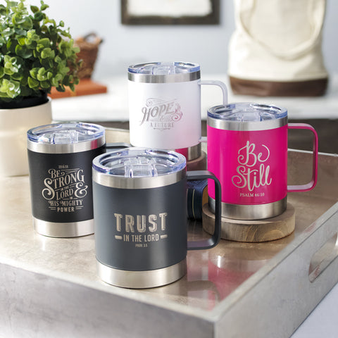Our stainless steel travel coffee mugs let you take your drink—and inspiration from Scripture—with you anywhere. Double-wall insulation ensures your beverage stays at just the right temperature.
