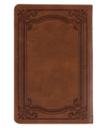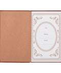 The tawny brown faux leather cover of the devotional is decorated with an ornate heat-debossed frame with beautiful corner scroll designs. A thin gold-foiled line rims the interior of the frame and matches the gold-foiled title and Scripture verse.