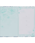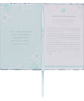 The prayer book features an elegant iron-gray faux leather cover decorated with white screen-printed flowers. The teal and gray-lettered sentiment is framed by a double bracket border and is presented in a multi-font design and accented with silver foil.