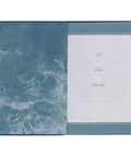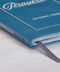 The cover of the teal faux leather prayer book features a simple, heat-debossed frame with a white shadow line that holds a white and heat-debossed title.