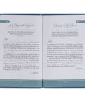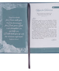 A teal satin ribbon marker is attached to the book's spine to mark your progress. A teal banner grounds the one-color-interior pages. Each of the 101 prayers features a title in a feminine script, a Scripture verse, and a prayer. Topics include Safe and Secure, Follow His Lead, and much more. Encouraging Scripture is interspersed and printed on pages with a teal stormy sea design.