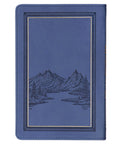 The prayer book's deep blue faux leather cover features a tranquil, heat-debossed illustration of a mountain landscape with mountains in the background, surrounded by trees and a river. A heat-debossed frame with a gold-foiled shadow line surrounds this image and the title, which is presented in blue and gold-foiled letters.