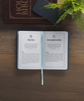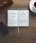 Blue topstitching along the edges of the prayer book reinforces an already sturdy book. Additional luxury features include 108 pages with elegant gold gilt edging, a ribbon marker for easy navigation, and a presentation page. The presentation and interior pages all feature the same intricate border design that decorates the cover. A stunning landscape illustration introduces you to the content and features a Bible verse that inspired the entire devotional.