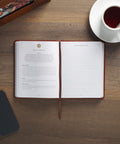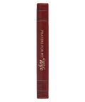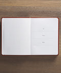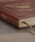 To ensure a quality binding, saddle-tan topstitching is applied along the rounded edges of the book. Luxury design features include gilt-edging on the page edges, a satin ribbon marker, and a two-color interior.