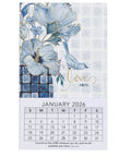 A delicate light blue mosaic tile pattern forms the background illustration on this calendar. Darker blue tiles form the shape of a vase, and light blue flowers outlined in gold foil cascade out of the vase. A blue bird perches on the first letter of the sentiment printed in foiled gold script.