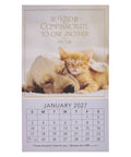 The adorable image of a light brown puppy and an orange tabby cat sleepily snuggling at the top of the small magnetic calendar offers a peaceful backdrop for your yearly planning. Surrounding the scene, a thin gold border adds a touch of elegance and matches the sentiment written in gold-foiled print above the animal scene.