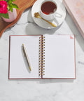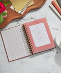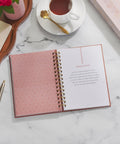 The spiral-bound prayer journal has an elegant terracotta pink cover. Star-shaped geometric designs with UV-varnished highlights decorate the background, and the title is held in a gold frame. It’s a great addition to any bedside table. Keep it close to wherever you spend your morning devotional time.