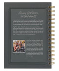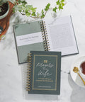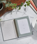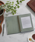 The moss-green hardcover journal has a gold spiral binding. A geometric design with UV-varnished accents rests in the background, and the title is displayed in white and gold-foiled font. It’s a handsome design that looks nice on a dark wood dresser or bedside table.