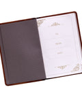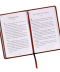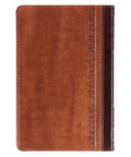 The toffee brown front and back covers of the faux leather prayer book are connected to a walnut brown faux leather spine with a double row of topstitching on each cover. Heat-debossed vertical borders accent the seams and are embellished with gold-foiled details. The title is presented in gold-foiled letters, and a heat-debossed subtitle is set below it and underlined with a gold-foiled flourish accent.