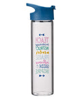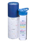 The clear glass water bottle features a royal blue plastic cap and a colorful screen-printed inspirational sentiment that is presented in a variety of fonts and colors.