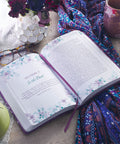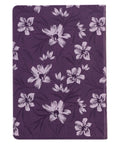 The devotional's purple faux leather cover is printed with lilac-purple flowers in full bloom supported by heat-debossed stems. The title and subtitle are placed in the center of the design and foiled in gold.