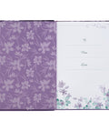 - Purple cover with printed lilac flowers and heat-debossed stems