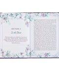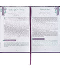 The faux leather devotional opens to lovely purple end pages, followed by a presentation page that lets you personalize the book or inscribe it with a message when you give it as a gift. The two-color printed interior pages feature purple floral bouquets at each top corner and purple banners that highlight areas of the page. A purple satin ribbon marker is included for your convenience.