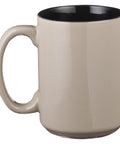 The high-gloss black interior of the cafe au lait-colored ceramic mug creates a striking contrast. This practical ceramic coffee mug is not just a beautiful gift, but a versatile one, too. It holds 14 fl oz of any beverage, hot or cold, and comes packaged in a tuck-top gift box. It has a generous handle that easily accommodates a man's hand and will look good on any desk holding coffee or even pencils.