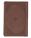 The flexible front cover of the faux leather journal features a wide border filled with intricate scrollwork, framing a tan appliquéd patch. The patch is topstitched to the design and heat-debossed with a Scripture verse.