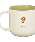 A black rim separates the creamy white exterior from the sage green interior of the cup. A wide handle that easily fits three fingers extends from the side of the mug.