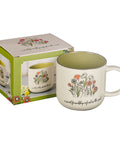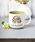 The creamy-white exterior of the ceramic coffee mug features a line-drawn bouquet of flowers with orange petals and green leaves. The sentiment is scribbled below it in an informal black font.