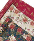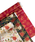 The three-piece wrapping paper set is designed around a festive poinsettia and winter greenery theme.