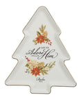 The white ceramic plate is shaped like a Christmas tree. It is rimmed in gold and has a glossy white finish. The center is adorned with a floral arrangement of poinsettias, berries, pinecones, and greenery in warm seasonal hues, and the sentiment is displayed in elegant black letters.