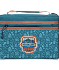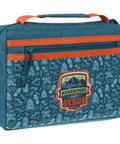 The teal polyester cover celebrates outdoor life with a light blue pattern of camping boots, backpacks, footprints, and campfires. At the center of the front cover, a bold rubber patch with mountains and Scripture proclaims the sentiment in white, teal, and orange letters accented with a yellow banner.