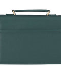 The Bible case's rich teal back panel wraps around the spine and is attached to the front panel with a secure, double-row of teal topstitching. A gossamer taupe leaf design is watermarked on the creamy white front panel, and gold-foiled flourishes are added to each corner to accentuate the sentiment that is printed in its center. The sentiment is presented in teal multi-font lettering accented with gold foil to create an elegant vintage feel.