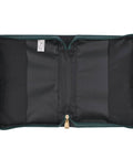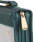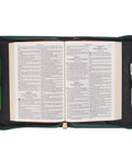 A teal zip with a gold-toned metal zipper pull that is engraved with the word Grace, closes the cover and keeps your Bible and other contents safe and secure. A lay-flat handle is attached to the spine with gold-toned metal handle hardware, and two pen loops within the case allow you to take pens, highlighters, and pencils wherever your Bible goes for convenient note-taking.