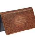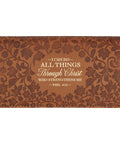 The All Things Honey-brown Faux Leather Checkbook Wallet is a beautiful way to protect your checks and share some inspiration, whether writing checks at the grocery store or a charity event. One glance at the encouraging Scripture verse will remind you that Christ is your anchor, and through his strength, you can be content in all circumstances.
