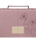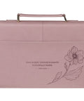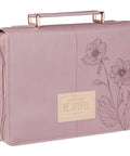 The Bible case has a soft, modern, feminine style. Its smooth, dusty-mauve faux leather is marked by a double row of topstitching that separates the cover into two halves. The right side is heat-debossed with an elegant pressed-flower line drawing of anemone–style blooms. An appliquéd tan contrast patch is centered on the lower part of the front cover and highlights the heat-debossed sentiment.
