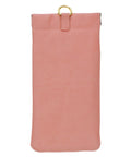 The case holds two pairs of glasses—reading glasses in the smaller front pocket and sunglasses in the larger one. The larger pocket has a snap-top closure that keeps glasses safe, and both pockets are lined with soft white microfiber to prevent scratches. A built-in cloth in the main pocket makes it easy to clean your lenses. A gold metal ring on the back lets you attach the case to a purse or keychain.