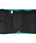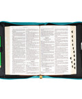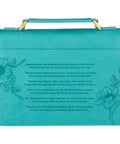 The front cover of the bright teal faux leather Bible case displays two branches of blooming blossoms that signify new life. The sentiment is placed in the lower right-hand corner and presented in an elegant gold-foiled script.