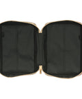 The case is designed for support and durability, with a honey-brown faux leather panel inset at the zipper and a matching faux leather lay-flat handle at the top. The zipper sports a gold metal zipper pull, and inside the case, you will find two pen loops to store pens or highlighters.