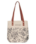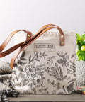 The natural canvas bag boasts chic tawny brown handles and a stunning black floral pattern that is screen-printed on the bottom panel. A plain top panel holds the black screen-printed sentiment that is framed with a thin black frame that incorporates the Scripture reference.