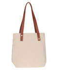 A sturdy zipper with a gold-toned metal zipper pull securely closes the main pocket of the cotton-lined tote bag. An exterior slip pocket on the back panel is useful for storing car keys, your phone, or loose notes. The tawny-brown handles are secured to the bag with brushed gold rivets and the rounded corners and a sturdy base make this tote bag perfect for a variety of items.