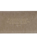 The front of the checkbook wallet is crafted from smooth, mottled taupe faux leather, attached to slightly darker pearlized faux leather that stretches over the spine and back panel. The sentiment is foiled in gold script on the front, while an additional Scripture verse is added to the back in gold-foiled letters.