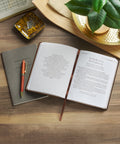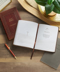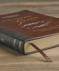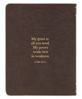 Amazing Grace comes with a simple chestnut brown faux leather cover. The espresso brown spine and back cover complement the front of the book. The book's exterior design alludes to God’s amazing act of grace displayed on the cross: a heat-debossed image of a crown of thorns gives a solemn reminder of Christ’s sacrifice. The brilliant gold-foiled title surrounds the crown of thorns—a reminder of Christ’s radiant present glory.