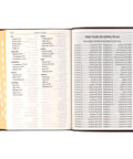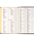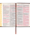 The long-lasting cover is sturdy, and when the Bible is opened, its Smyth-sewn binding allows it to lay completely flat. A brown satin ribbon acts as a placeholder, while the black thumb-indexing tabs help the reader navigate the Bible. Topstitching along the edges of the flexcover Bible ensures durability, and gilt-edged pages add a subtle elegance to a classic design.