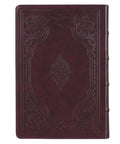 The rich dark brown faux leather cover is decorated with a heat-debossed antique fleur-de-lis scrolled frame design. Similarly, the title is presented in a gold-foiled antique font, while the version reference is simply capitalized and heat-debossed.