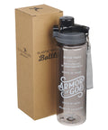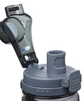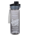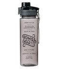 - Black water bottle with white text