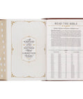 The back cover mirrors the stunning art nouveau frame and adds a heat-debossed quatrefoil design at the center. The gold-foiled title and KJV version reference on the spine are accentuated by heat-debossed lines sandwiched between gold-foiled bands. The Bible is complete with gilt-edged pages, enhancing its overall elegance.
