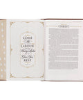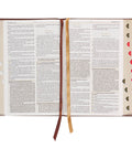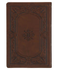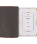 The front cover of this toffee brown faux leather Study Bible features a beautifully heat-debossed ivy art nouveau design that elegantly frames the title. The gold-foiled title and version reference add a touch of sophistication to the front cover.