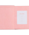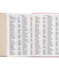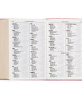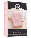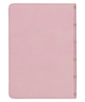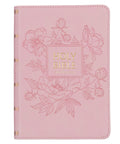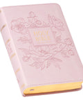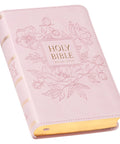 The Bible features a beautiful ballet pink faux leather front cover adorned with a charming floral outline design, gracefully encircling a scalloped heat-debossed frame. Within this frame, the title is elegantly presented in gold-foiled letters.