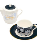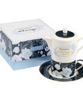 This gorgeous blue-accented ceramic tea set consists of a white teapot decorated on both the front and back with baby blue florals surrounding a gold foiled dotted vignette that holds the sentiment.