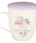 The back of the mug repeats the floral design and features a white frame edged in purple that hems the Scripture reference.