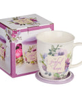 The creamy white ceramic mug is decorated with an arrangement of soft purple flowers that grow around a square-shaped white frame with rough edges. The sentiment is presented in green and purple lettering inside the frame.