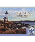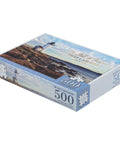The puzzle beautifully showcases a solitary lighthouse perched atop the cliffs, overlooking a serene bay. The sentiment is artfully highlighted in gold foil and creates a striking contrast against the backdrop of a cloudy blue sky.