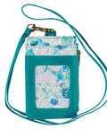 The front of the ID card holder features three credit card slots, 1 in teal and 2 in the pretty floral print. A teal faux leather band with a brass snap-button clip covers the three front credit card slots to secure your cards.