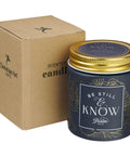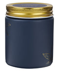 The candle is housed in a frosty navy glass jar adorned with delicate gold-foiled floral decals that surround a square white frame on the front of the jar. The frame displays the sentiment in white.
