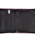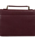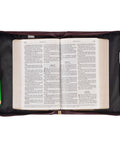 A burgundy faux leather lay-flat handle with gold-toned metal hardware folds out of the way when the case is opened, and a gold-toned cross engraved metal zipper pull is attached to a burgundy zipper to secure the contents of the Bible case. You can easily place notes or verse cards in the exterior slip pocket on the back and use the interior pen loops to hold pencils or highlighters.