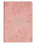 Light pink topstitching extends around the edges of both covers of this journal to ensure the faux leather stays intact. A light pink satin ribbon marker attached to the spine lets you keep your place as you write. There are 336 lined pages inside this journal. A unique Bible verse at the bottom of each page gives you a source for memorization, meditation, or prayer. Lastly, the golden gilt-edged pages add an understated shimmer to the design.