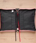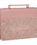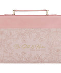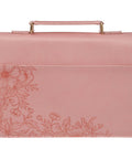 The front panel meets a smooth pink faux leather spine that continues onto the back to form one continuous piece where a handy slip pocket is built in for storing loose notes and papers. The same soft pink faux leather is used for the lay-flat handle that is attached with sturdy gold metal hardware for easy carrying. A wrap-around zipper with a cross-engraved zipper pull secures your Bible inside the case where two elastic pen loops provide space for your favorite pens or highlighters, and two satin ribbon markers are anchored in the spine so you can easily keep track of multiple passages.
